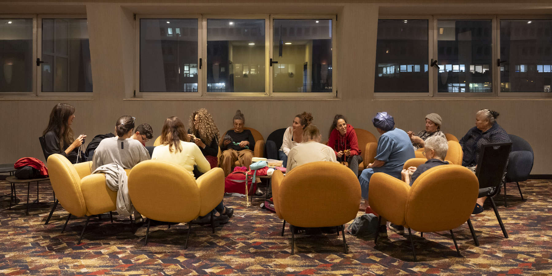 מעגל סריגה במלון מפונים במסגרת מיזם "עין טובה". המיזם, שהחל כפעילות הפגה המסיחה את הדעת עבור תושבים עקורים שפונו מביתם לבתי מלון, הפך להיות, מעבר לפעולת הסריגה, גם מעגל חברתי אליו נאספות לא רק נשים מבוגרות אלא גם ילדים וילדות, מתיישבים במעגל ופשוט מדברים.